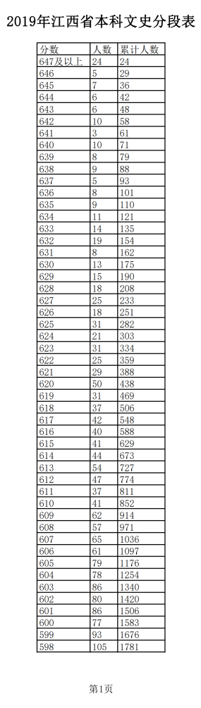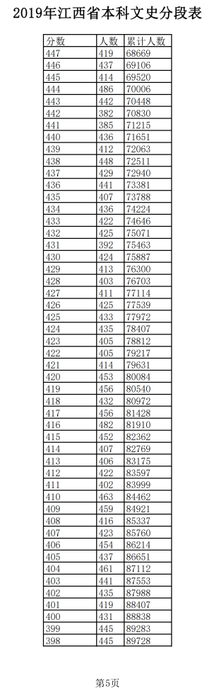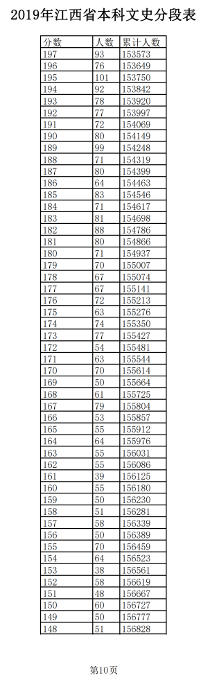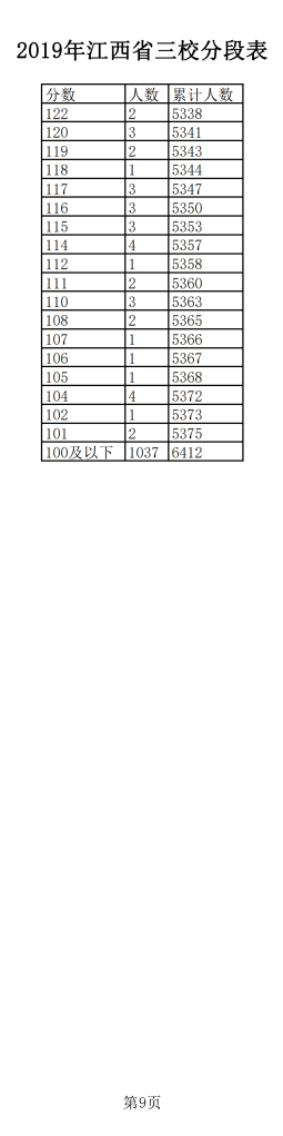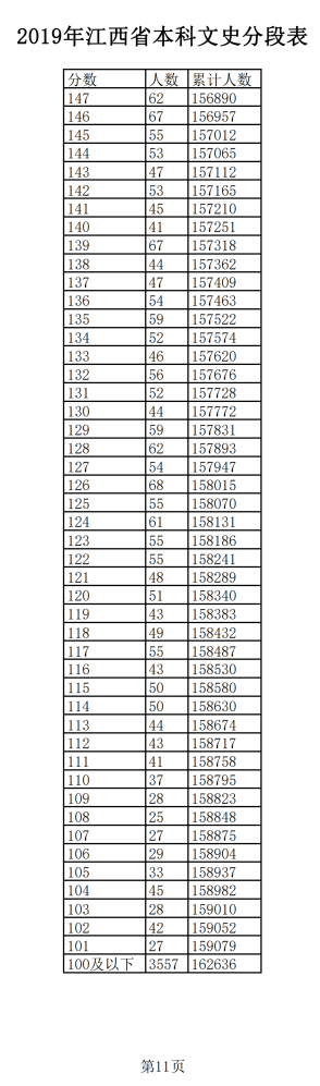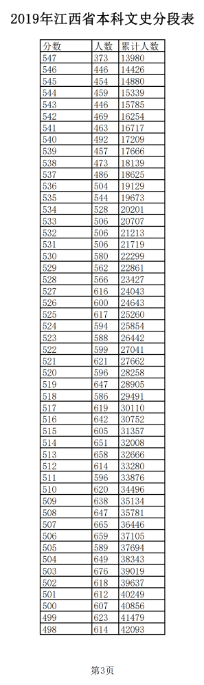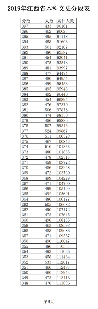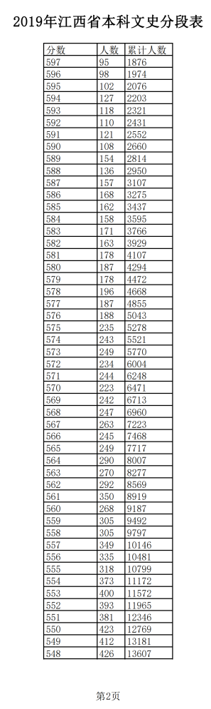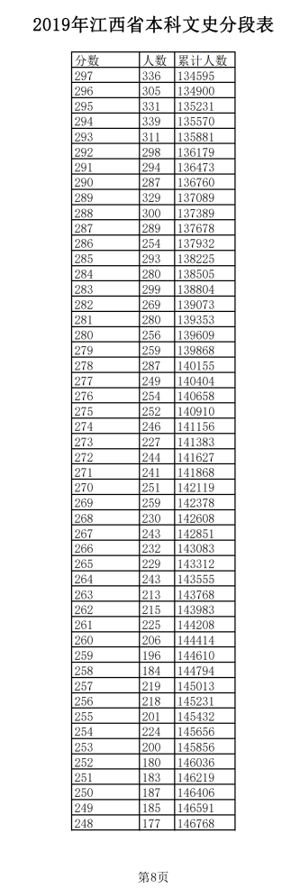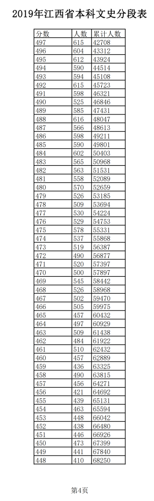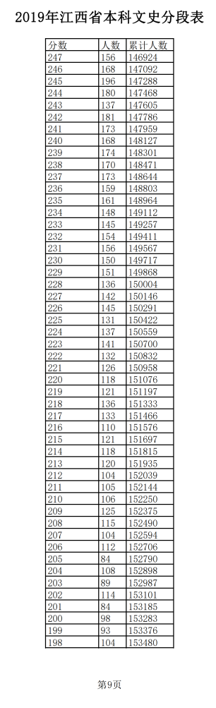 2019年江西普通高考文科成績分段統(tǒng)計(jì)表
