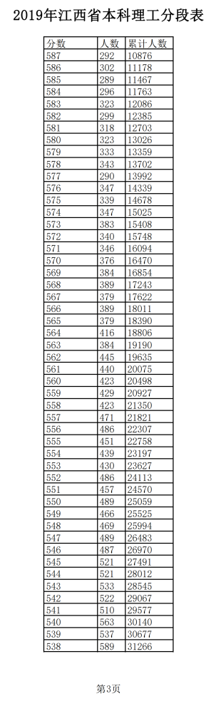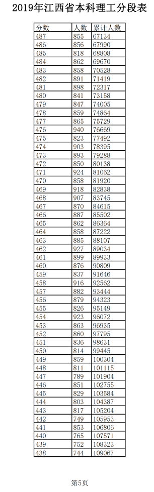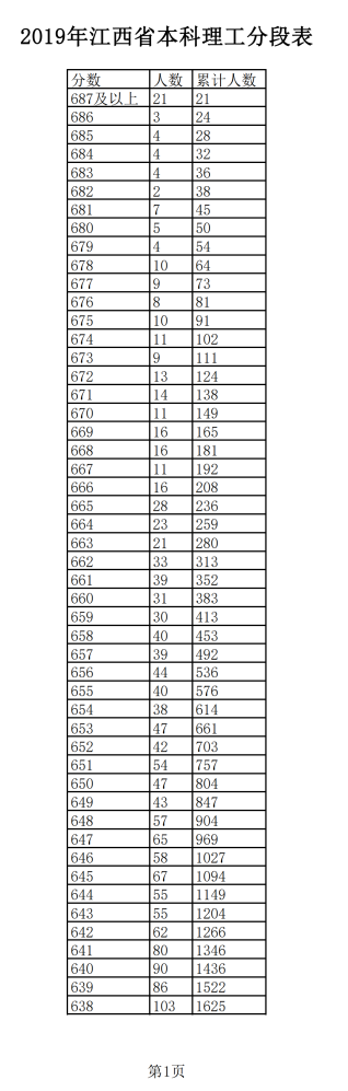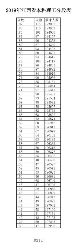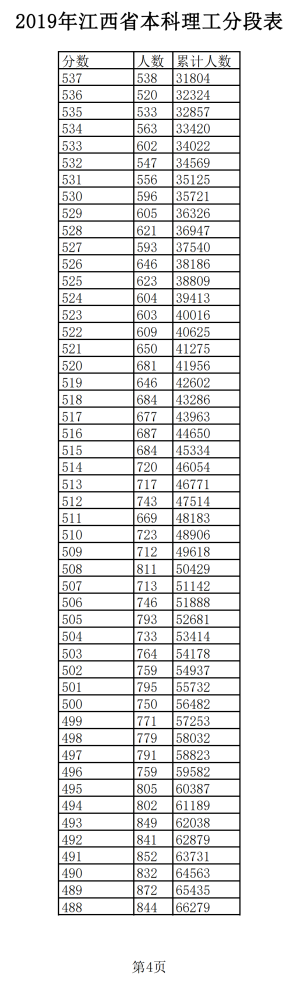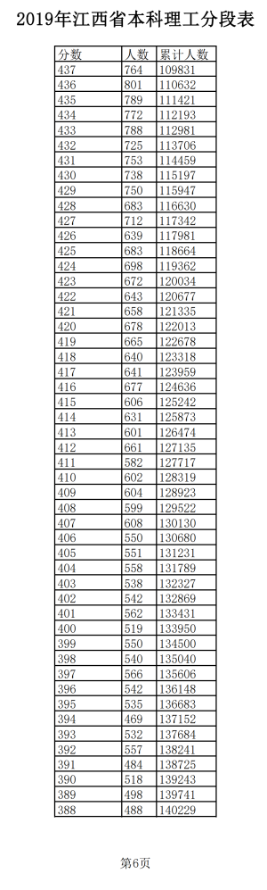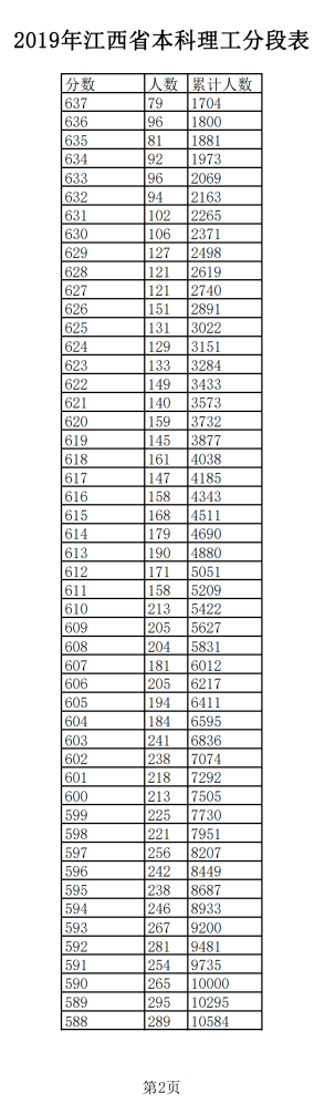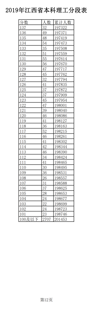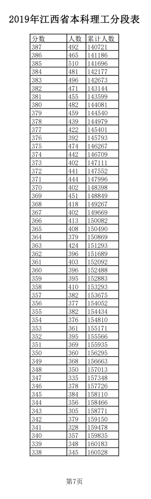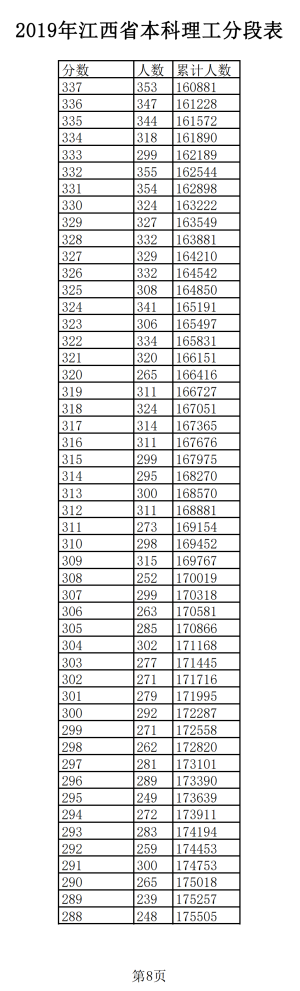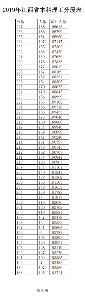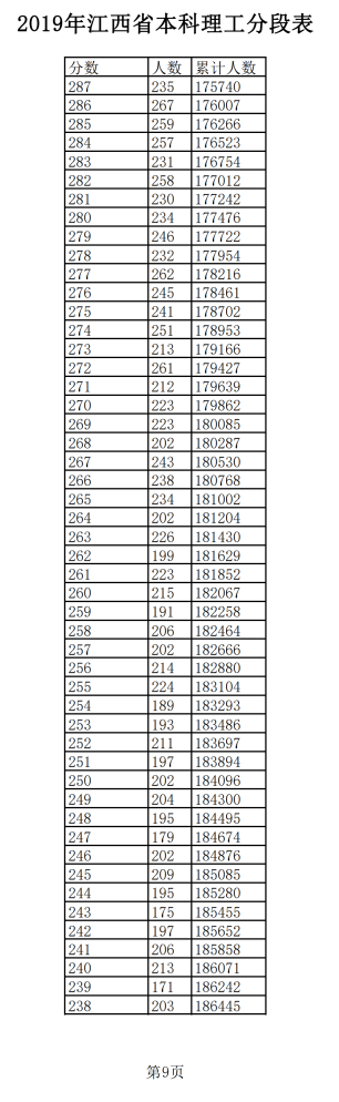 2019年江西普通高考理科成績分段統(tǒng)計(jì)表