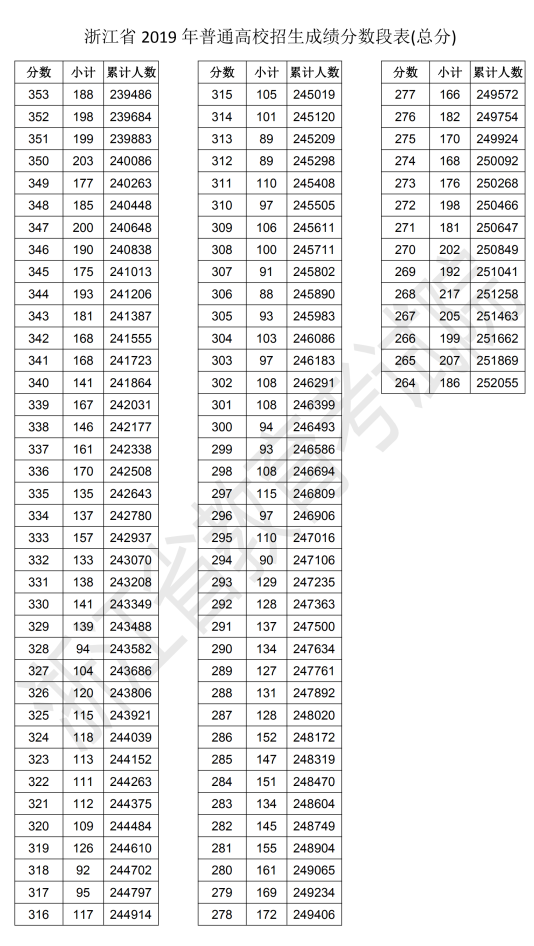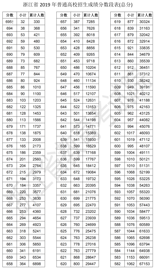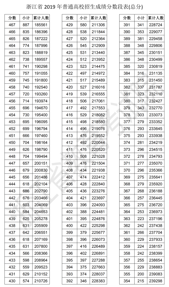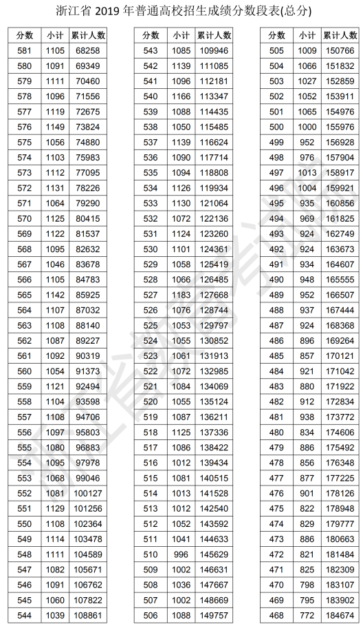 浙江省2019年普通高校招生成績(jī)分?jǐn)?shù)段表