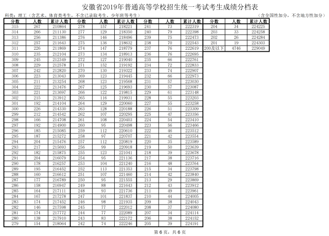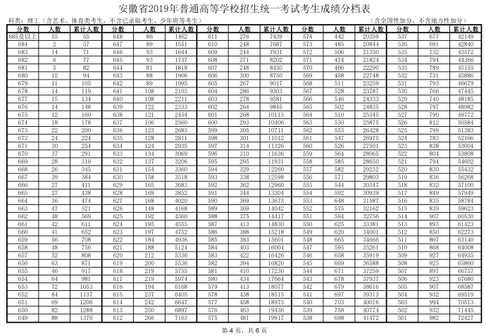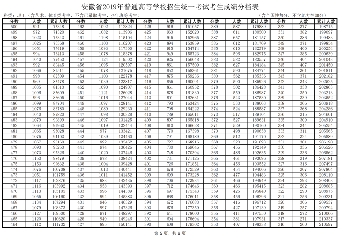 安徽省2019年普通高校招生考試成績(jī)一分一段表(理工類)