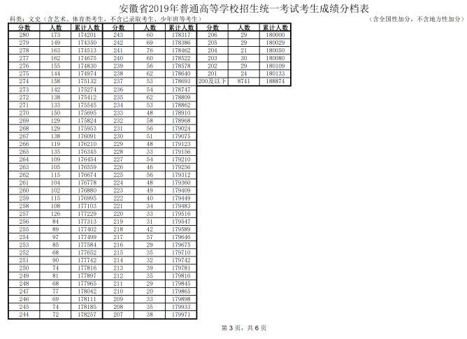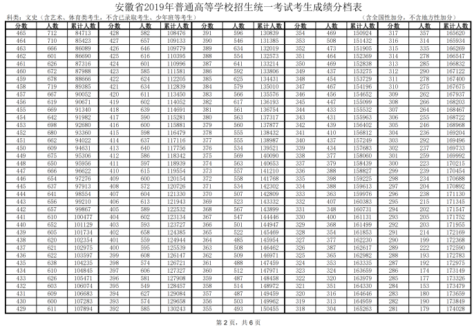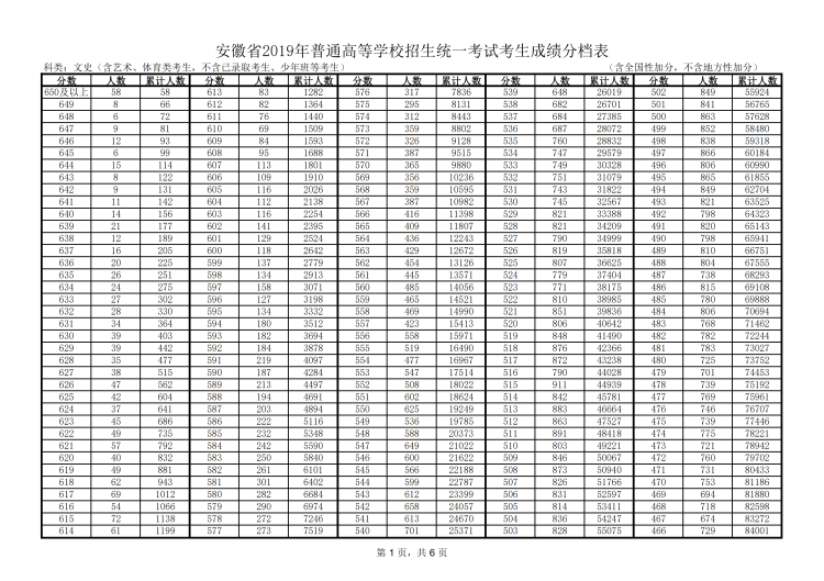 安徽省2019年普通高校招生考試成績(jī)一分一段表(文史類)