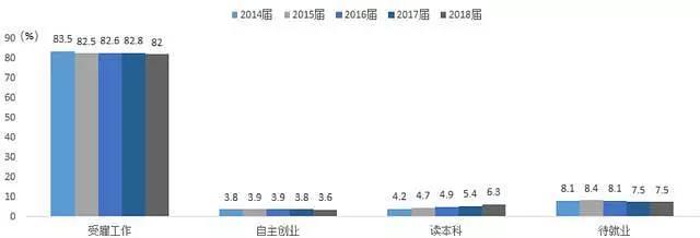 2018屆高職高專畢業(yè)生“受雇工作”的比例為82.0%,較2014屆下降1.5個百分點;“自主創(chuàng)業(yè)”的比例(3.6%)較2014屆(3.8%)略有下降;“讀本科”的比例(6.3%)連續(xù)五屆上升,較2014屆增長2.1個百分點(圖3)。