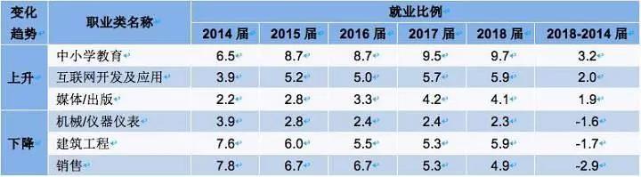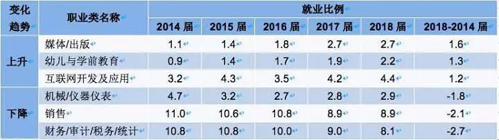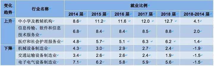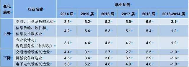 表5 2014~2018屆本科畢業(yè)生就業(yè)比例上升、下降最多的前三位行業(yè)