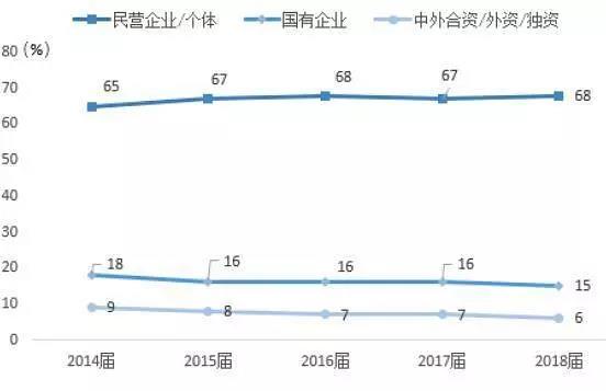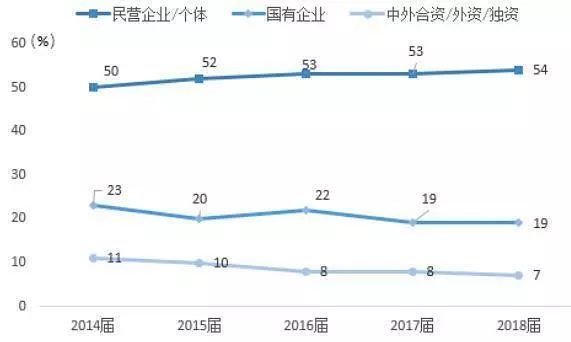 圖4 2014~2018屆本科畢業(yè)生在“民營企業(yè)/個體”“國有企業(yè)”“中外合資/外資/獨資”企業(yè)就業(yè)的比例變化趨勢