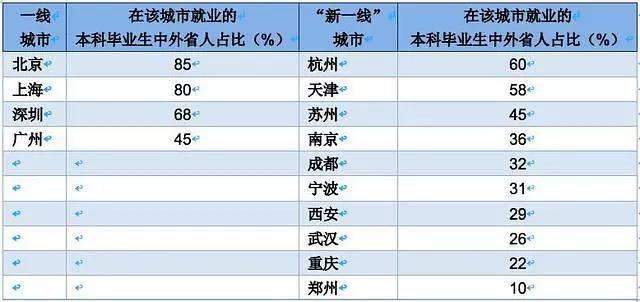 在“新一線”城市就業(yè)的應屆本科畢業(yè)生中,外省籍畢業(yè)生占比從2014屆的27.9%上升到了2018屆的37.3%。在主要的“新一線”城市中,在杭州就業(yè)的本科畢業(yè)生中外省籍占比(60%)最高,其次為天津(58%),均超過一線城市中的廣州(45%)(表9)。