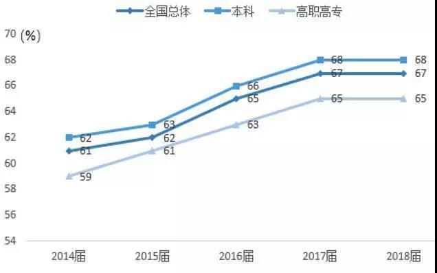 近五年應屆畢業(yè)生就業(yè)滿意度持續(xù)上升。2018屆大學畢業(yè)生的就業(yè)滿意度為67%,其中,本科、高職高專畢業(yè)生的就業(yè)滿意度分別為68%、65%(圖8)。