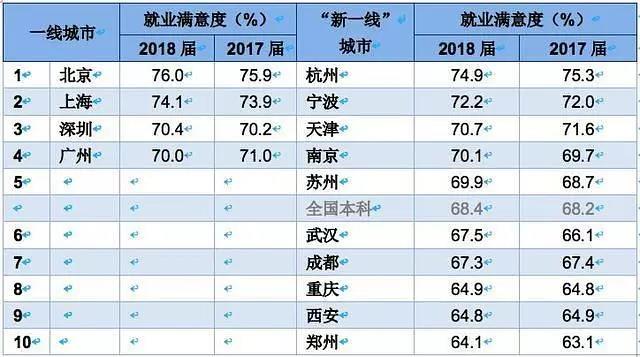 表10 2017屆、2018屆本科畢業(yè)生在各主要城市就業(yè)的滿意度情況