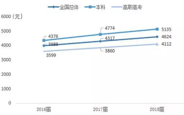 從近三屆的趨勢可以看出,應屆大學畢業(yè)生月收入呈現(xiàn)上升趨勢。2018屆大學畢業(yè)生月收入高于城鎮(zhèn)居民2018年月均可支配收入(3271元)。