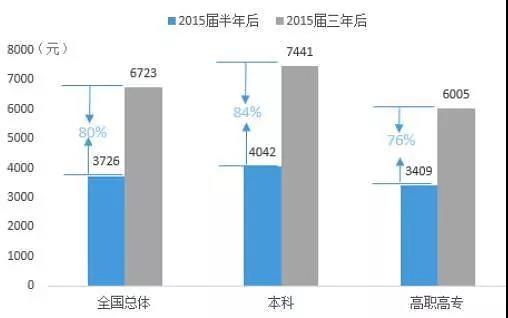 在本科學科門類中,2015屆畢業(yè)生三年后月收入最高的是工學,為8169元,高出該學科門類半年后月收入(4313元)3856元,漲幅為89%;三年后月收入最低的是教育學(6093元),高出該學科門類半年后月收入(3698元)2395元,漲幅為65%。在高職高專專業(yè)大類中,2015屆畢業(yè)生三年后月收入最高的是電子信息大類,為6901元,高出該專業(yè)大類半年后月收入(3673元)3228元,漲幅為88%;三年后月收入最低的是文化教育大類(5160元),高出該專業(yè)大類半年后月收入(3227元)1933元,漲幅為60%。