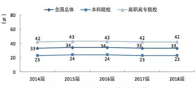 2018屆大學畢業(yè)生半年內(nèi)的離職率為33%,近五年畢業(yè)生離職率穩(wěn)定。其中,2018屆本科和高職高專畢業(yè)生畢業(yè)半年內(nèi)的離職率分別為23%、42%(圖13)。