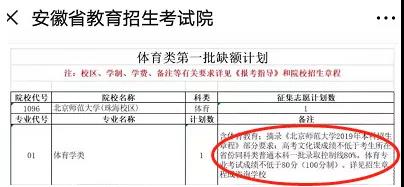 荔枝新聞注意到,北師大2019年本科招生章程錄取規(guī)則明確:“體育教育專(zhuān)業(yè)只招收理科生(文理不分的省份除外,浙江、上海不限選考科目)。在高考文化課成績(jī)不低于考生所在省份同科類(lèi)普通本科一批錄取控制線(合并一、二本招生的省份及上海市為自主招生參考線,浙江為一段線)80%,體育專(zhuān)業(yè)考試成績(jī)不低于80分(100分制)的條件下,按照進(jìn)檔考生的體育專(zhuān)業(yè)考試成績(jī)擇優(yōu)錄取”。