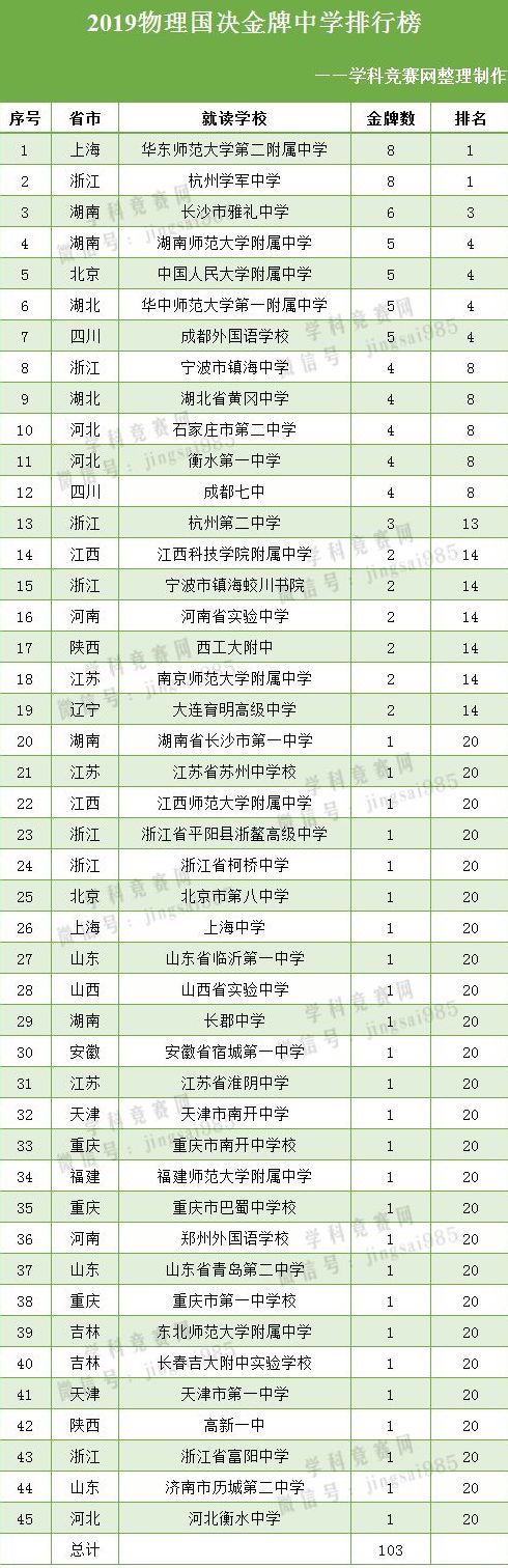與省內(nèi)的省級聯(lián)賽不同,國決是全國所有省份考生的直接對決,在決賽中拿下的金牌數(shù)量,很大程度上能夠反映中學/省份的物理競賽實力。那么,在今年的物理競賽比拼中,各中學之間的戰(zhàn)況如何?