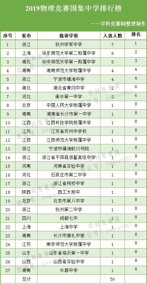 和往年一樣,今年共有50人進入物理國集隊,這50人分別來自于27所中學和13個省市。