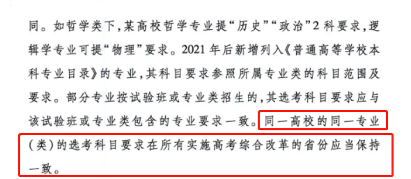 此前,教育部相關(guān)文件《普通高校本科招生專業(yè)選考科目要求指引(通用版)》內(nèi)容對各高校各專業(yè)的選考科目要求做了新的調(diào)整,要求“從2021年秋季入學(xué)的高一新生開始實行”并明確“同一高校的同一專業(yè)(類)的選考科目要求在所有實施高考綜合改革的省份應(yīng)當(dāng)保持一致?!?/span>所以,實行高考綜合改革的21省市在選考要求上,均可參考甘肅省的這份《選科要求》。