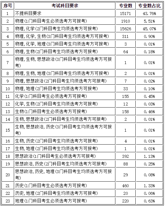 從表中我們可以看出:在34670個本科專業(yè)中,共有23種不同的選科要求。