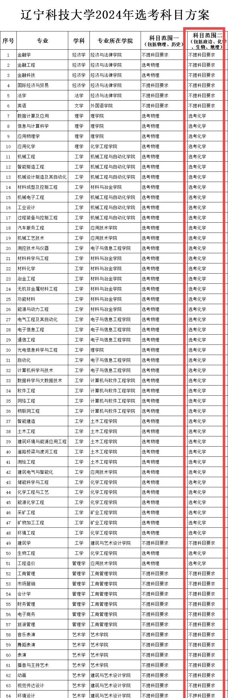 具體調(diào)整的科目數(shù)量為:遼寧科技大學(xué)2024版方案中要求“化學(xué)”科目的專業(yè)數(shù)量為44個,占所有專業(yè)的67.69%;2022、2023版中要求化學(xué)的專業(yè)數(shù)量僅為1個。