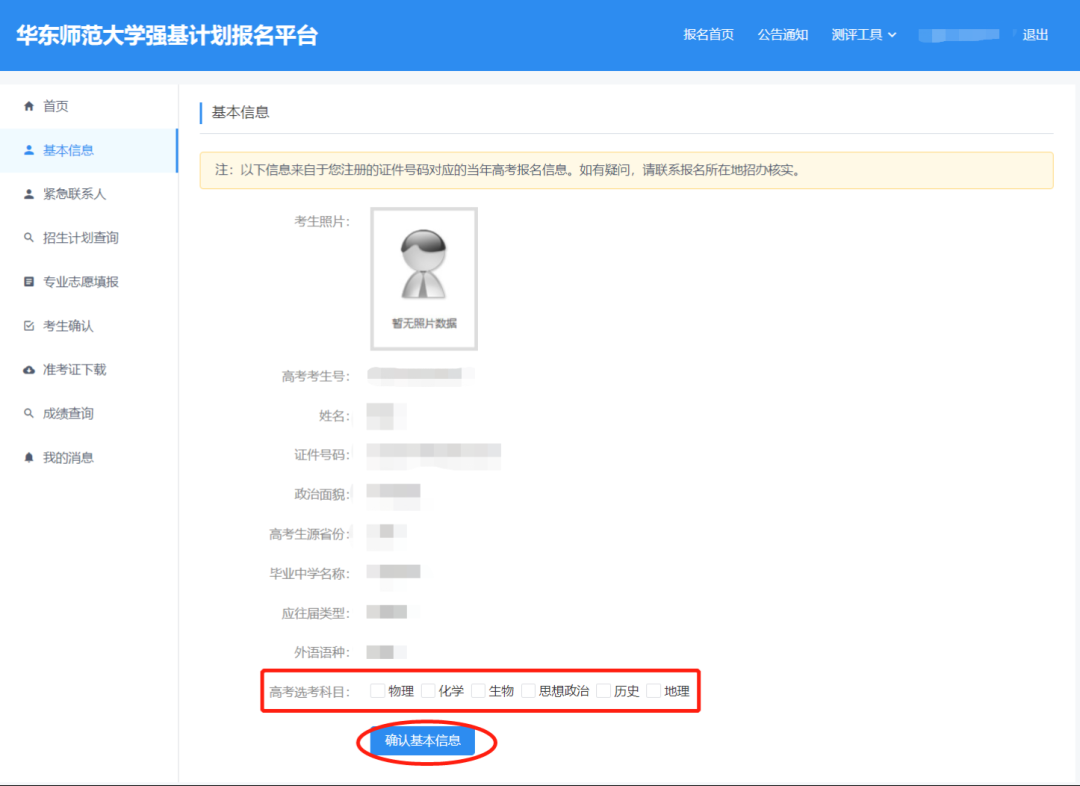 核對“報名基本信息”頁面顯示信息。高考改革省份的考生還需勾選選考科目。