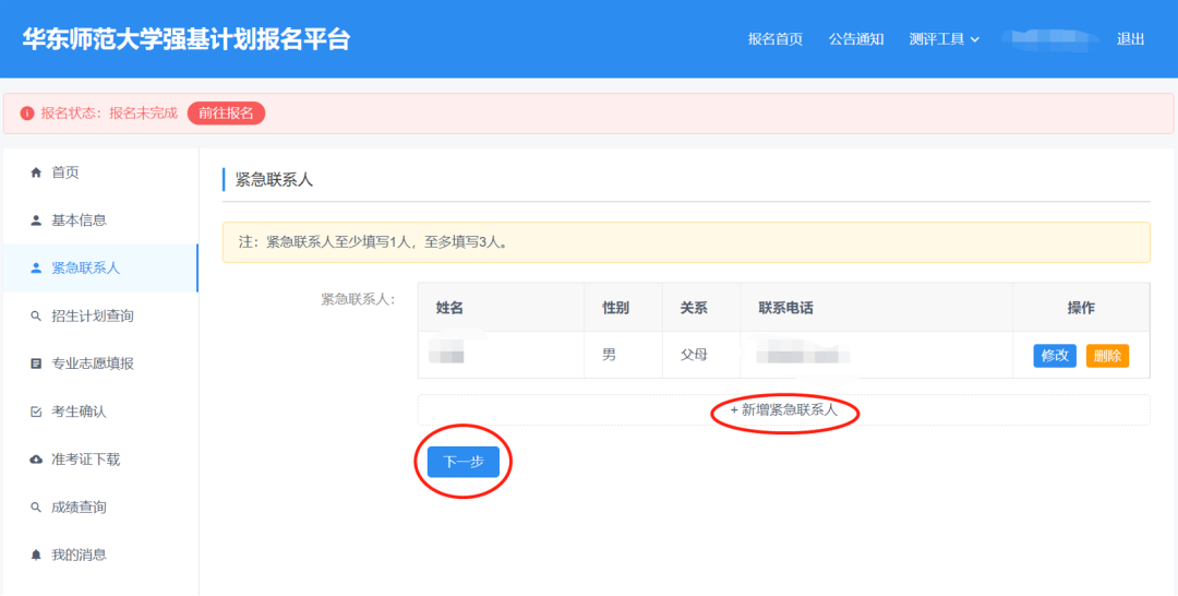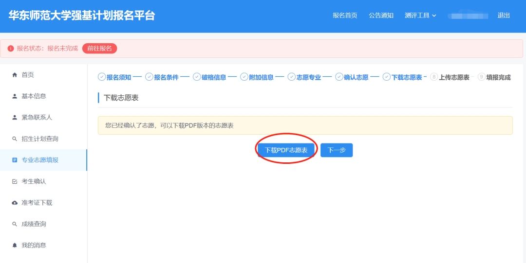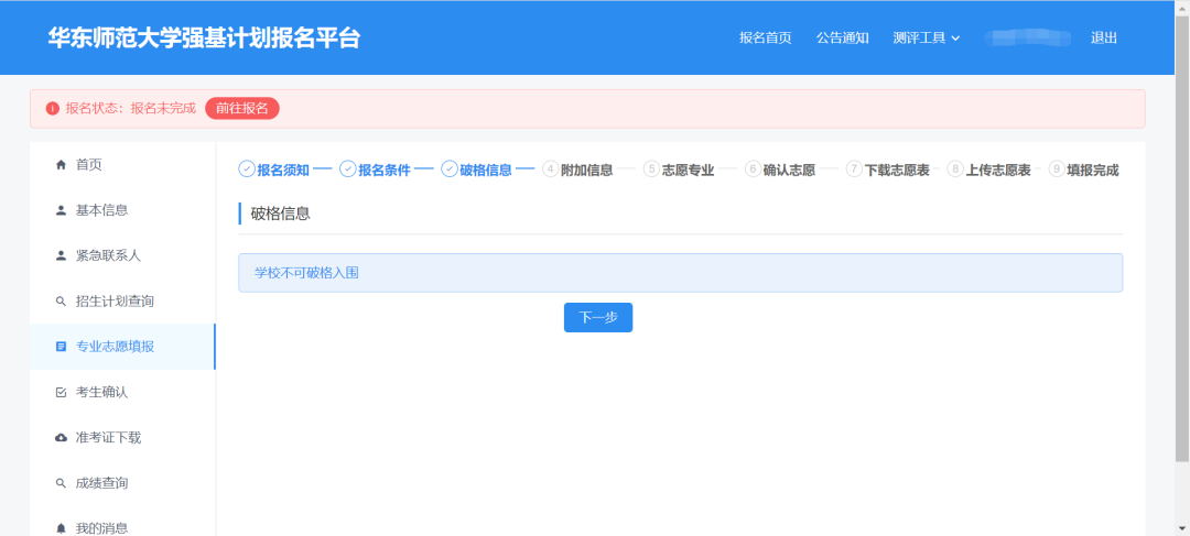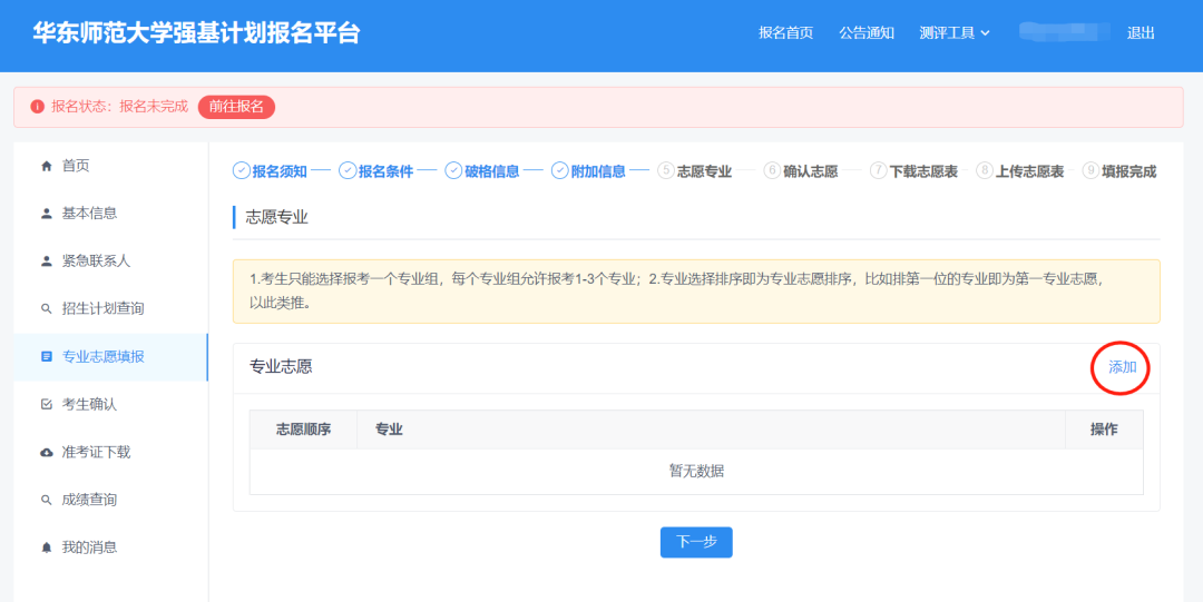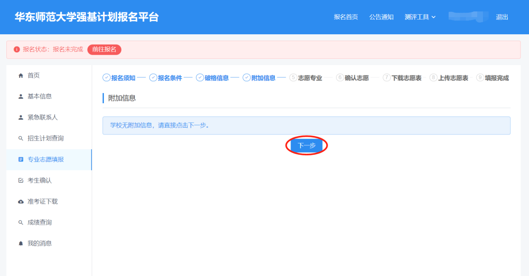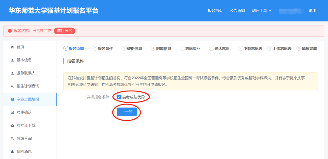 選擇報名條件“高考成績優(yōu)異”,并點擊“下一步”。