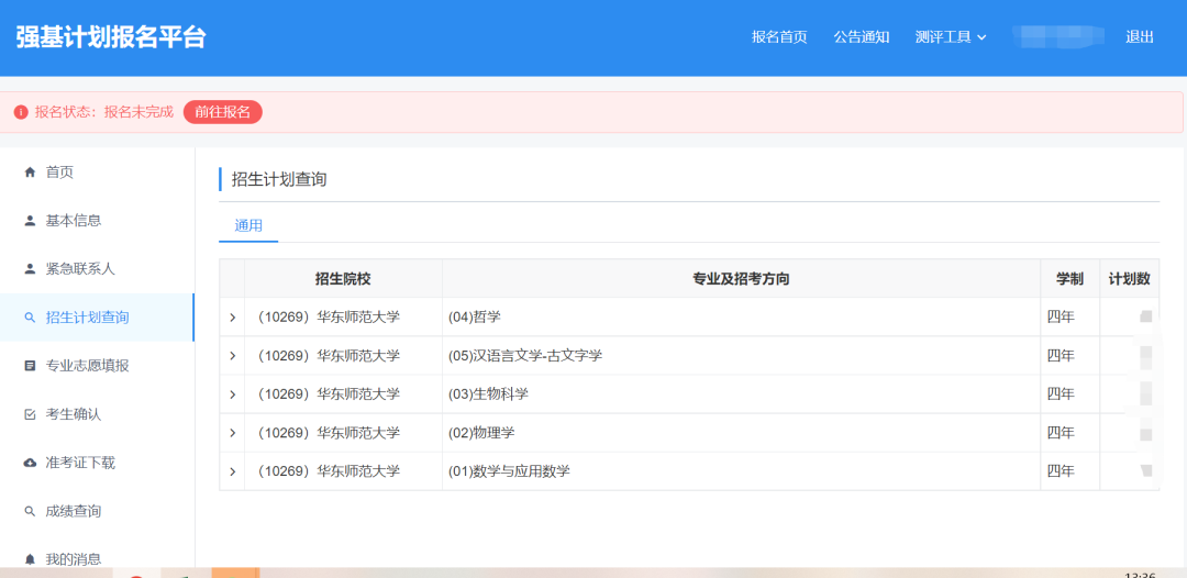 點擊“招生計劃查詢”,查看當年招生計劃。