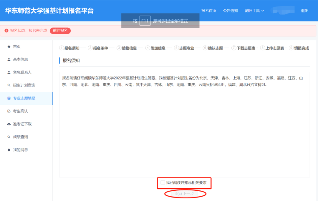 閱讀“報名須知”,勾選“我已閱讀并知悉相關要求”,等待進入下一步。