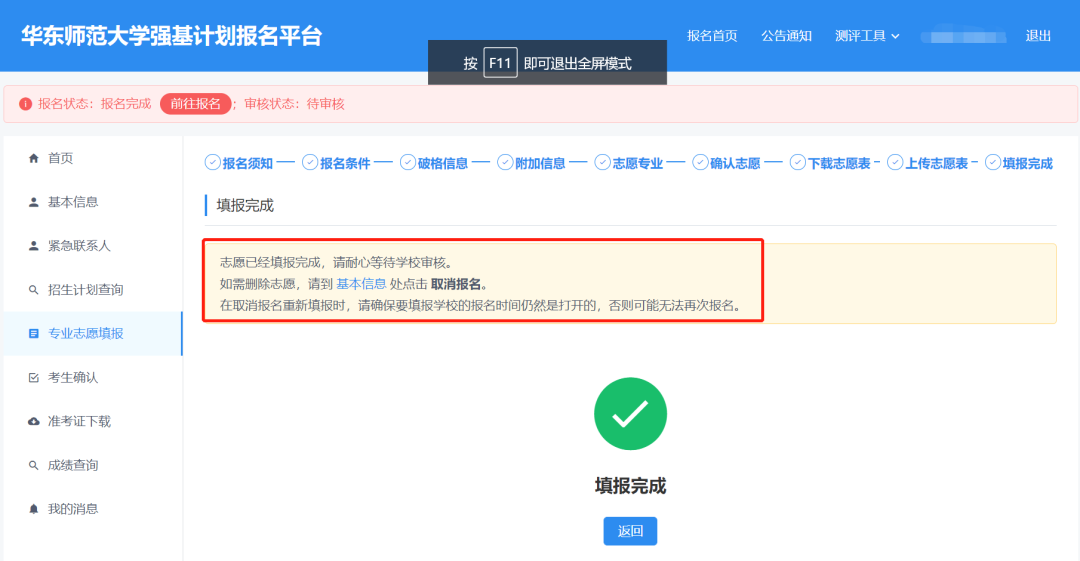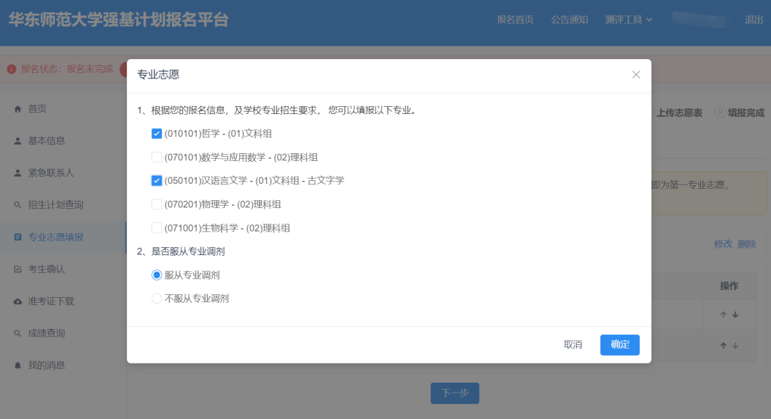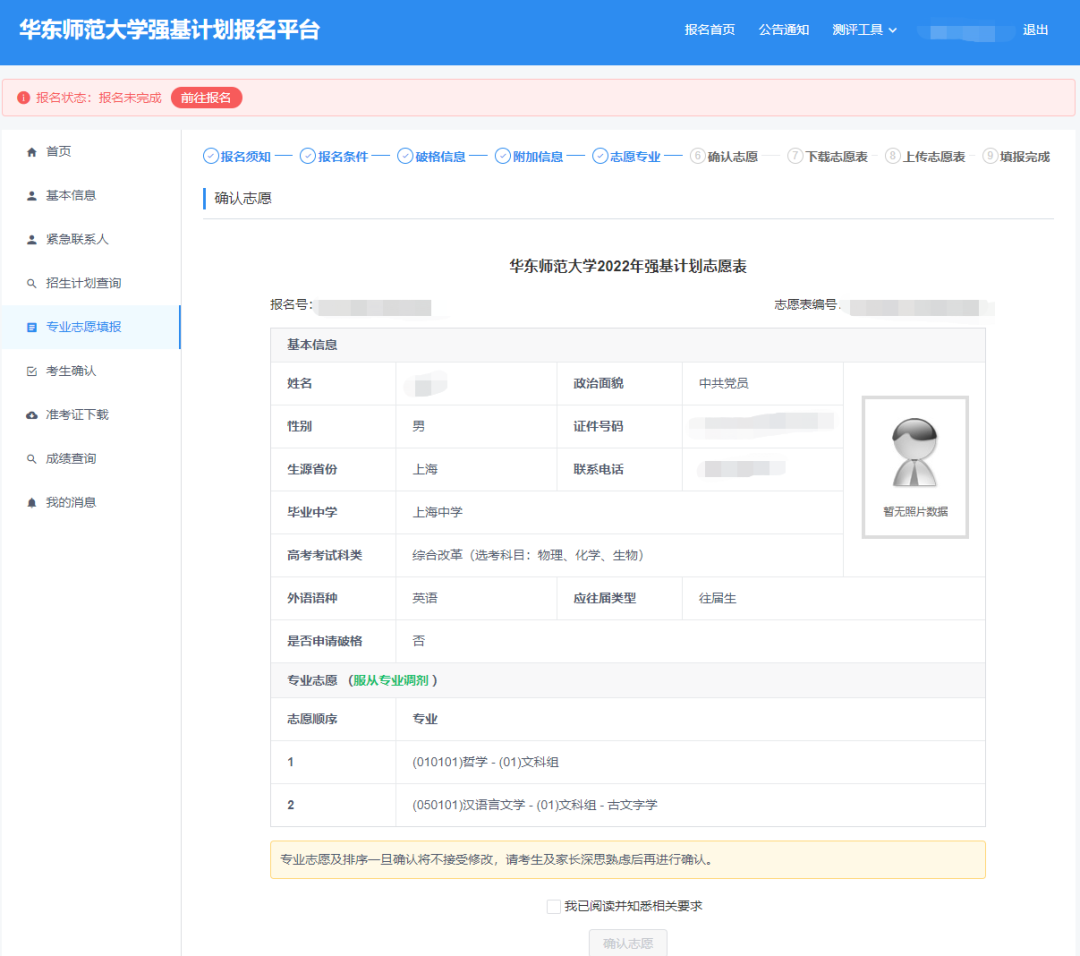 請仔細核對志愿信息。一旦確認專業(yè)志愿將不能更改;如需更改只能在報名時間段內(nèi)取消報名后重新報名。