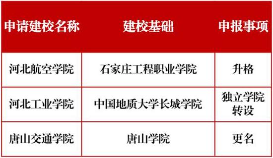 2017年10月16日,河北省教育廳發(fā)布關(guān)于2017年列入專家考察的申報設(shè)置高等學(xué)校的公示,將組織省高校設(shè)置評議委員會專家對中國地質(zhì)大學(xué)長城學(xué)院申請轉(zhuǎn)設(shè)為河北工業(yè)學(xué)院、石家莊工程職業(yè)學(xué)院升格為河北航空學(xué)院、唐山學(xué)院更名為唐山交通學(xué)院申報事項進(jìn)行實地考察。