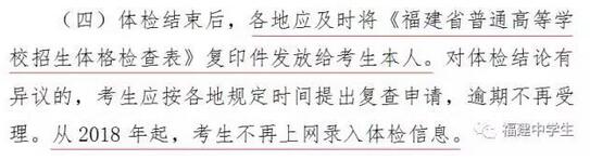我省高招體檢終檢時間定于2018年3月24日(比往年推后兩周),終檢醫(yī)院為福建省立醫(yī)院。對體檢結(jié)論有異議的,考生應(yīng)按各地規(guī)定時間提出復(fù)查申請,逾期不再受理。此外,體檢結(jié)束后,各地應(yīng)及時將《福建省普通高等學校招生體格檢查表》復(fù)印件發(fā)放給考生本人。從2018年起,考生不再上網(wǎng)錄入體檢信息。