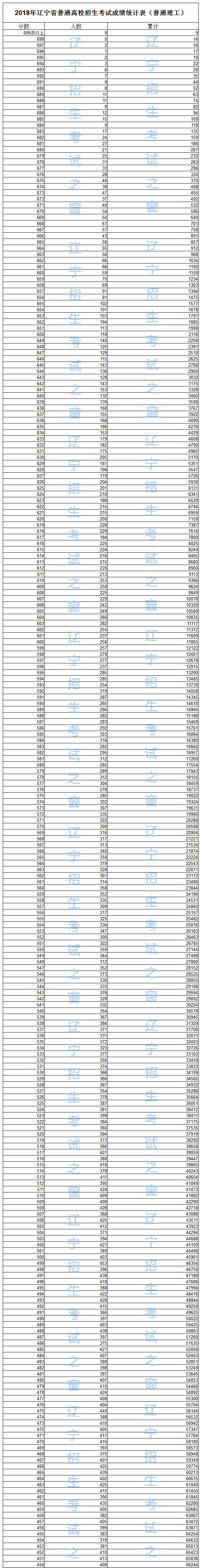 2018年遼寧省普通高考成績一分一段統(tǒng)計(jì)表(普通理工)