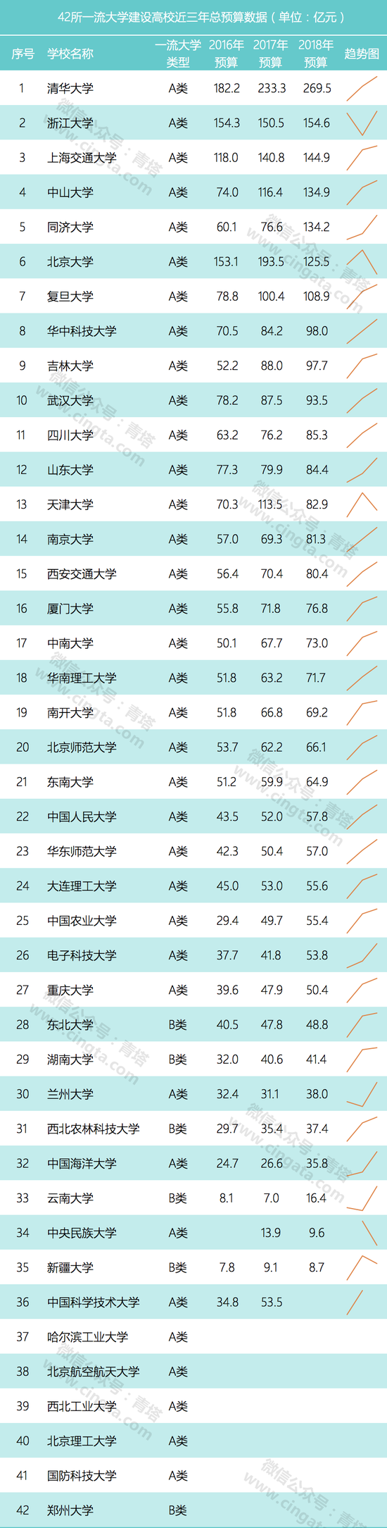 未公布的工業(yè)和信息化部直屬高校等幾所高校雖然沒(méi)有完整的預(yù)算數(shù)據(jù),但是從科研經(jīng)費(fèi)等數(shù)據(jù)來(lái)看,這些高校投入規(guī)模不會(huì)小。42所一流大學(xué)建設(shè)高校近三年預(yù)算經(jīng)費(fèi)如下(空白處表示未查到相關(guān)數(shù)據(jù)):