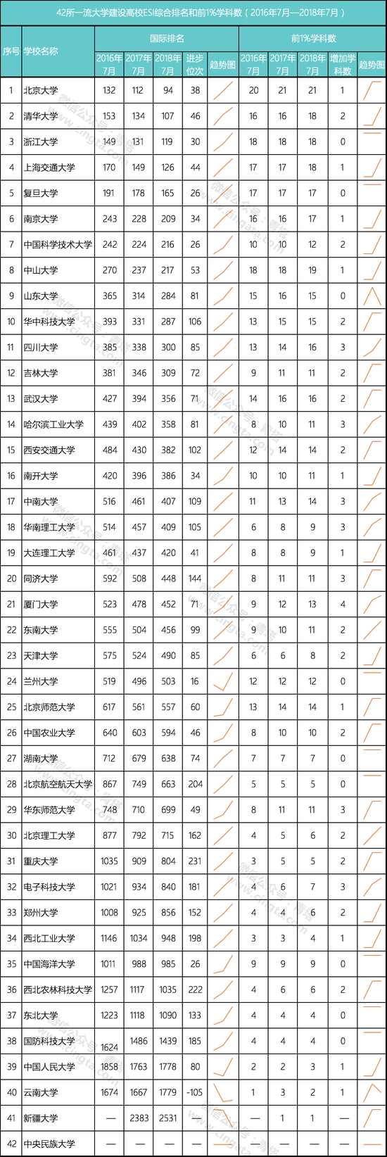 本部分青塔整理了2016年7月、2017年7月和2018年7月共三次ESI綜合排名和學(xué)科排名數(shù)據(jù)。從統(tǒng)計(jì)數(shù)據(jù)來(lái)看,大多數(shù)一流大學(xué)建設(shè)高校ESI綜合排名保持增長(zhǎng)態(tài)勢(shì),部分高校綜合排名增長(zhǎng)幅度很大,包括華中科技大學(xué)、西安交通大學(xué)、中南大學(xué)、華南理工大學(xué)、北京航空航天大學(xué)等。相對(duì)來(lái)說(shuō),大多數(shù)高校前1%學(xué)科數(shù)變化不大。