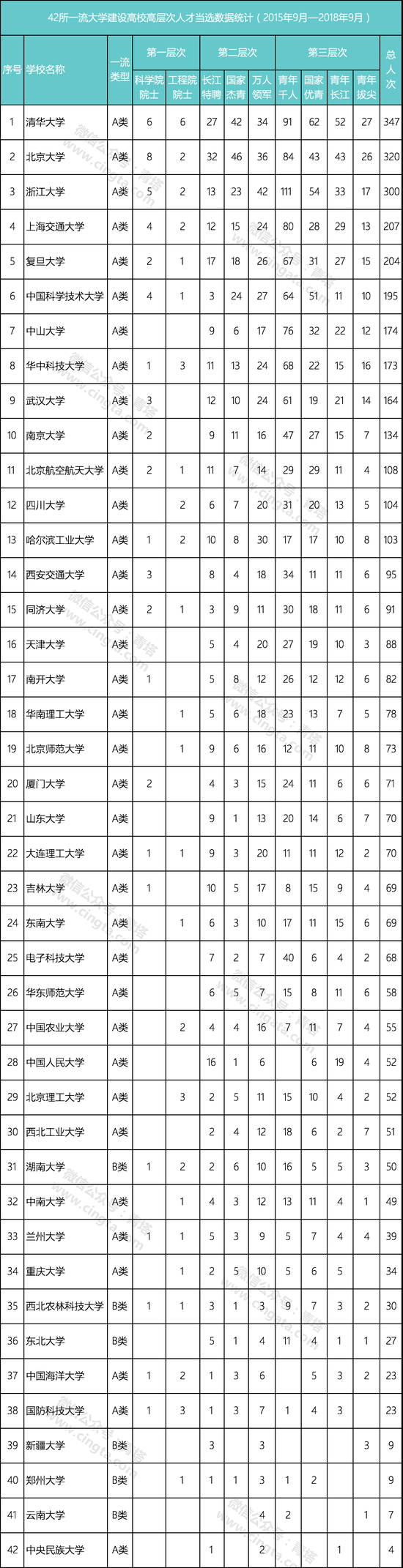 相比之下,鄭州大學(xué)、云南大學(xué)、新疆大學(xué)和中央民族大學(xué)等高校高層次人才增選數(shù)量較少,都不足10人。三年內(nèi)42所高校頂尖人才入選情況如下(兩院院士增選為2015年和2017年共2次,長(zhǎng)江學(xué)者增選了3次(2015年度、2016年和2017年度),國(guó)家萬(wàn)人計(jì)劃人才增選了2次(第二批和第三批),國(guó)家杰青(2016年、2017年和2018年),國(guó)家優(yōu)青(2016年、2017年和2018年)和青年千人(第12、第13和第14批次)。其中2017年度長(zhǎng)江學(xué)者和2018年國(guó)家杰青為公示數(shù)據(jù)。