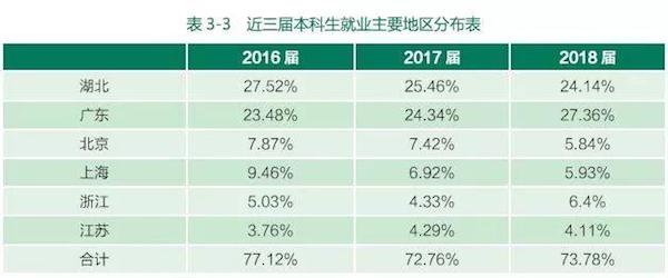武漢大學(xué)近三屆本科生就業(yè)主要地區(qū)分布表