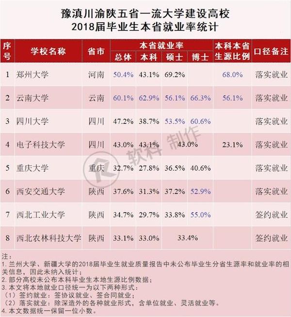 四川大學(xué)和電子科技大學(xué)的本省就業(yè)率均在40%以上,重慶和陜西的幾所一流大學(xué)的本省就業(yè)率也均超過(guò)30%,西安交通大學(xué)和西北工業(yè)大學(xué)博士畢業(yè)生的本省就業(yè)率甚至超過(guò)50%??梢?jiàn),成都、重慶、西安三座內(nèi)陸城市對(duì)于高校畢業(yè)生的吸引力還是很大的。