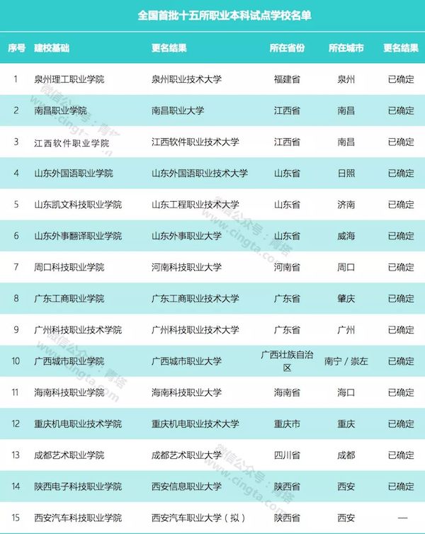 5月27日,教育部正式公布各個職業(yè)學院更名的消息。目前,除西安汽車科技職業(yè)學院尚未公布外,其中14所均正式公布了個更名結(jié)果,實現(xiàn)了更名“大學”,成為本科“職業(yè)大學”。