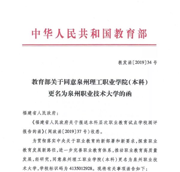 2019年5月27日,教育部正式批復福建省人民政府,“同意泉州理工職業(yè)學院(本科)更名為泉州職業(yè)技術大學,系民辦本科層次職業(yè)教育試點學校。