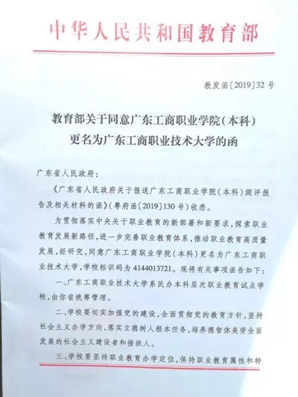 5月27日,教育部致函省人民政府,同意廣東工商職業(yè)學院(本科)更名為廣東工商職業(yè)技術大學,系全國民辦本科層次職業(yè)教育試點學校,代碼為4144013721,并批準10個本科招生專業(yè),今年正式啟動招生。